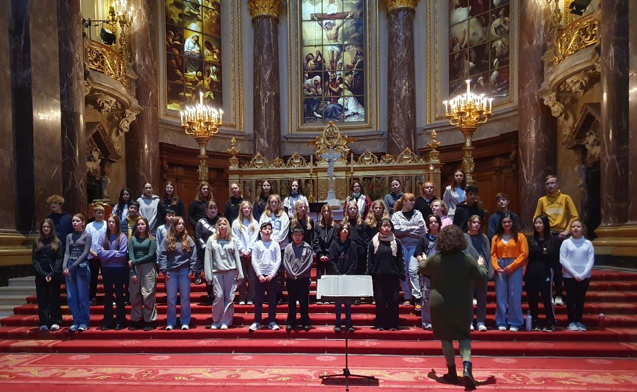 45 Choristen unserer Schule aus unserer Musikklasse und dem Oberstufenchor beteiligten sich an diesem besonderen Konzert im Berliner Dom. Die Aufregung war groß, denn für viele war es der erste Auftritt im Chor. Viele Eltern Großeltern und Geschwister waren gekommen, um die Schüler*innen zu unterstützen.