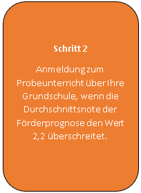 Wenn der Wert der Durchschnittsnote den 2,2 überschreitet, erhalten Sie von Ihrer Grundschule das Formular zur Anmeldung zum Probeunterricht. Sie können nun entscheiden, ob Sie Ihr Kind zum Probeunterricht anmelden möchten. Die Förderprognose, das Gespräch mit Ihrem Kind und die Beratung durch die Lehrkräfte Ihrer Grundschule sollen Ihnen hierbei als wichtige Entscheidungsgrundlage dienen. Eine Erklärung zum Probeunterricht und Informationen zum zeitlichen Ablauf finden Sie unter Schritt 2.