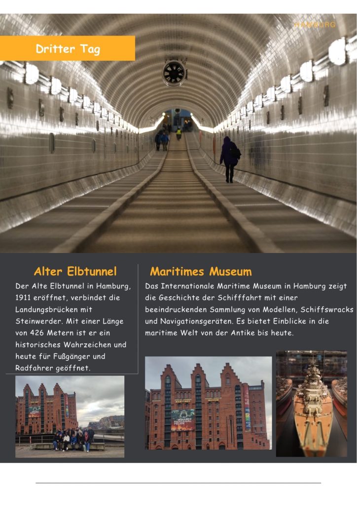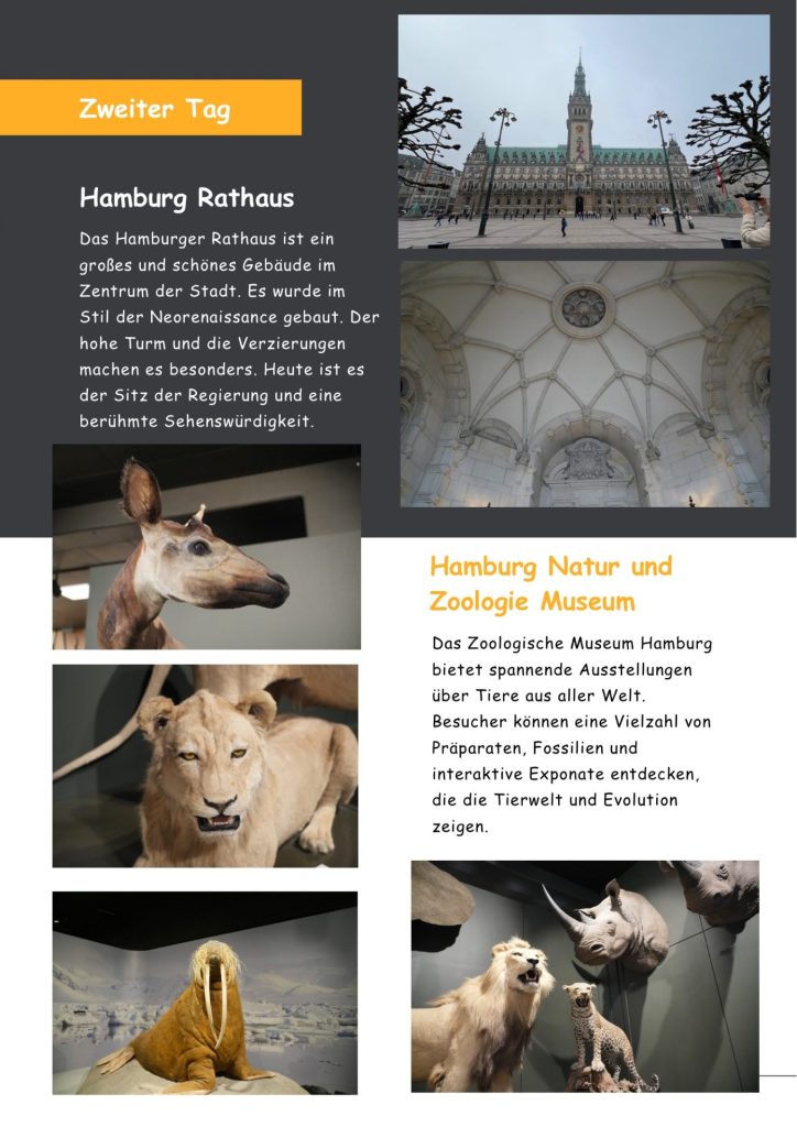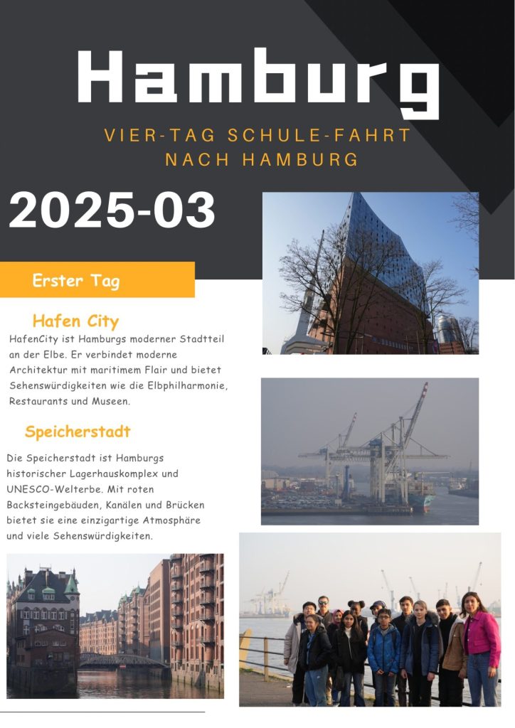 Die Willkommensklasse reiste nach Hamburg, um die kulturellen Schätze der Stadt zu entdecken. Wir gingen durch den alten Elbtunnel, bewunderten die Elbphilharmonie, besuchten das Hamburger Rathaus und erkundeten die Speicherstadt und das Zoologische Museum. In der Hafencity, dem Maritime Museum und der Kunsthalle tauchten wir tief in Hamburgs Geschichte und Kultur ein.