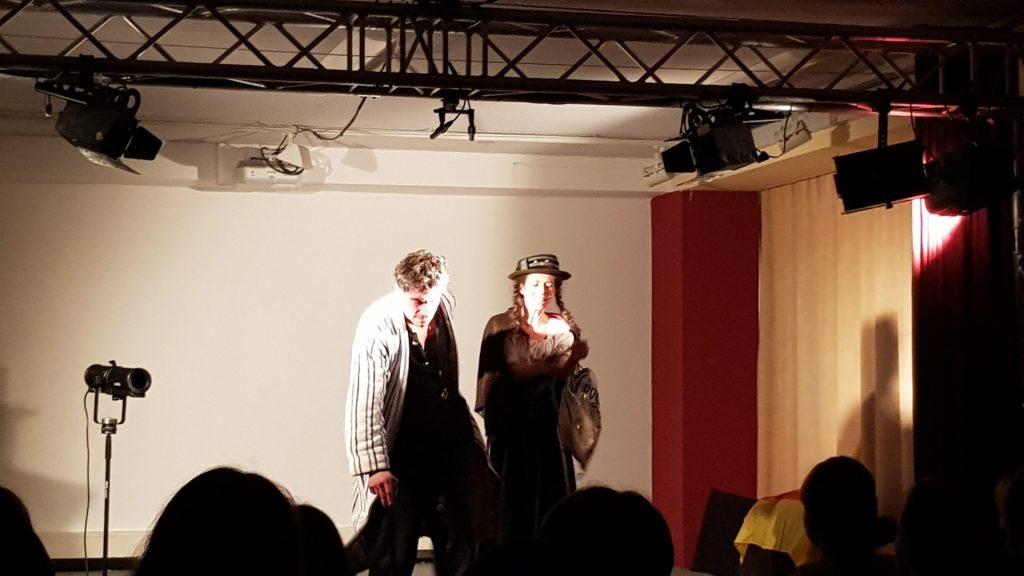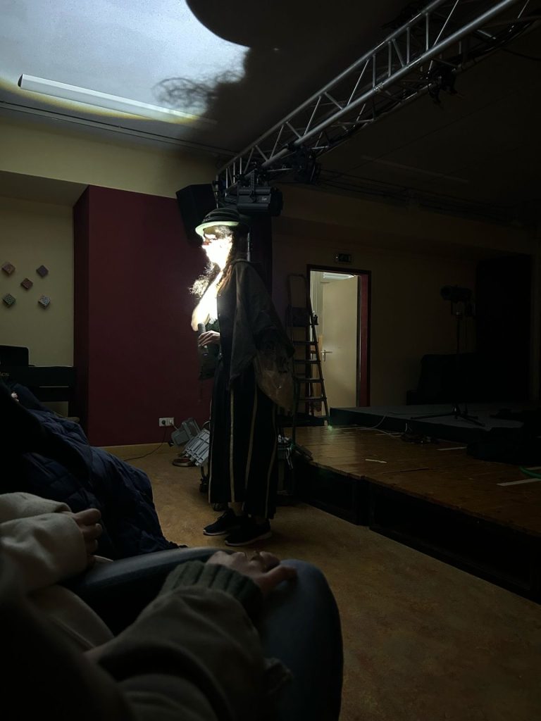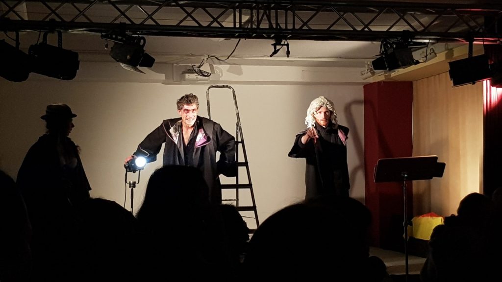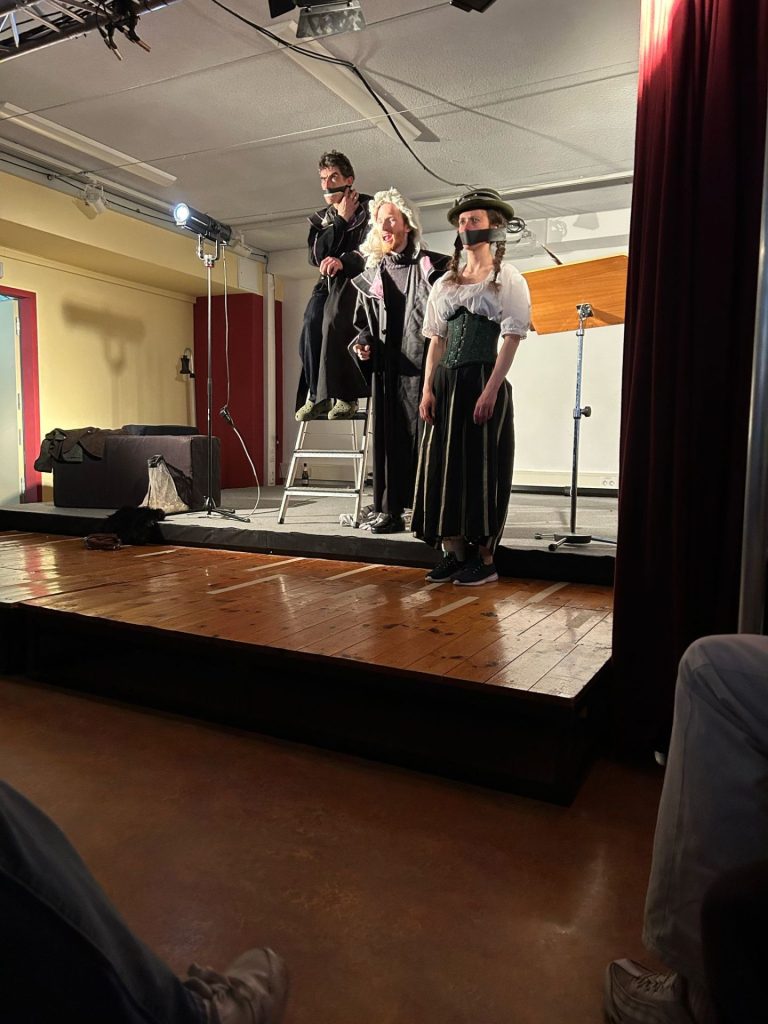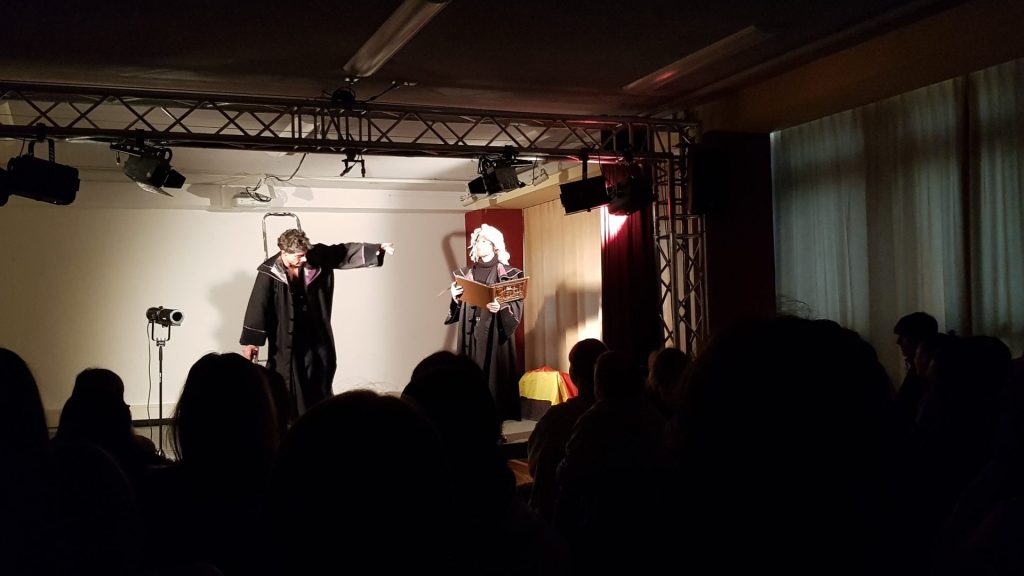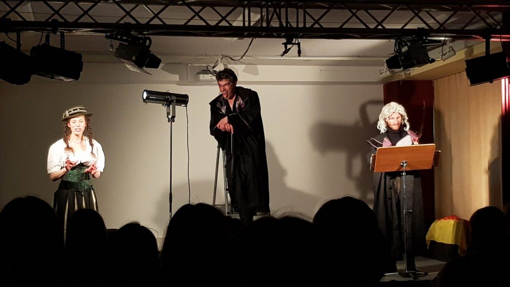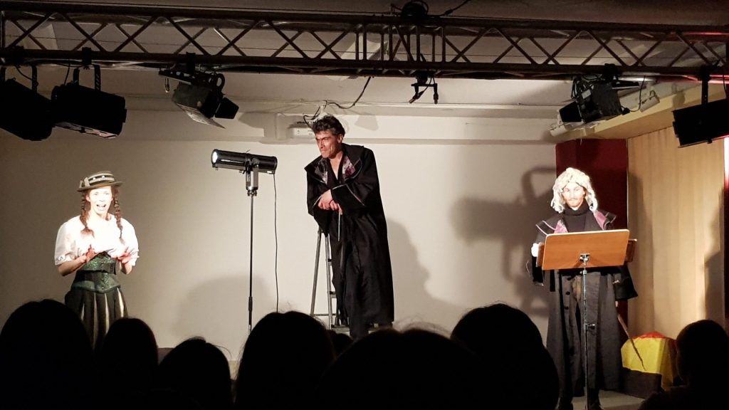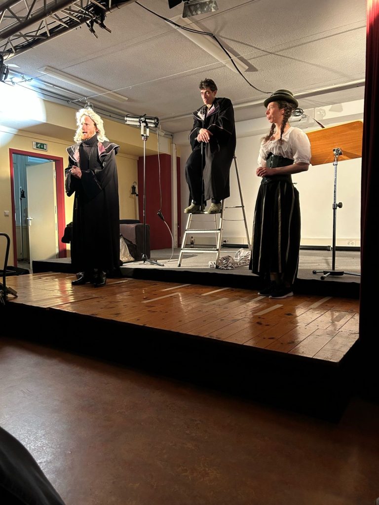 Schauspieler, die schreiend in den Theaterraum schreiten, über Stühle steigen und Zuschauende in die Handlung integrieren: Willkommen bei der Aufführung des „Zerbrochnen Krugs” des Überalltheaters am Tagore-Gymnasium am 31. März 2025.