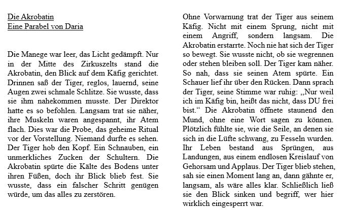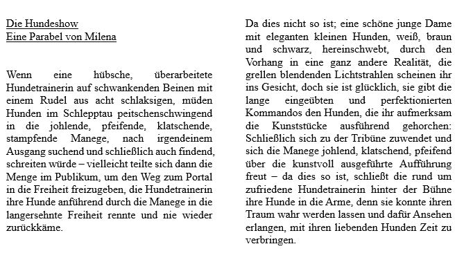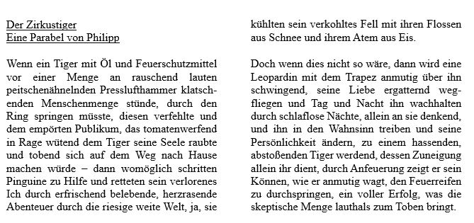 Der zweite lange Satz dagegen zeigt das reale Bild einer vitalen, schönen Dame als Reiterin voller Würde, glücklich mit ihrem Beruf und von ihrem Direktor hofiert und liebevoll umsorgt. Die Schülerinnen und Schüler sollten zu dieser Parabel eine Parallelparabel verfassen. Dabei sollte neben dem Zirkus als Ort des Geschehens auch die Art und Weise, wie Kafka seine Parabel schrieb, weitgehend übernommen werden: der Aufbau in zwei Teile, die vielen Aufzählungen, die langen Sätze, das Irreale und Reale im parabolischen Kontrast.