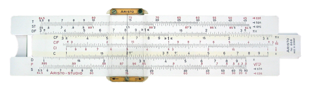Ein einfacher Rechenschieber (Fab. ARISTO). Die Zunge ist für eine Multiplikation mit 1,30 eingestellt, die Stellung des Läufers zeigt das Ergebnis 2,60 für den Faktor 2,00. (Quelle: CC BY-SA 3.0, Roger McLassus, WiKiMEDIA)